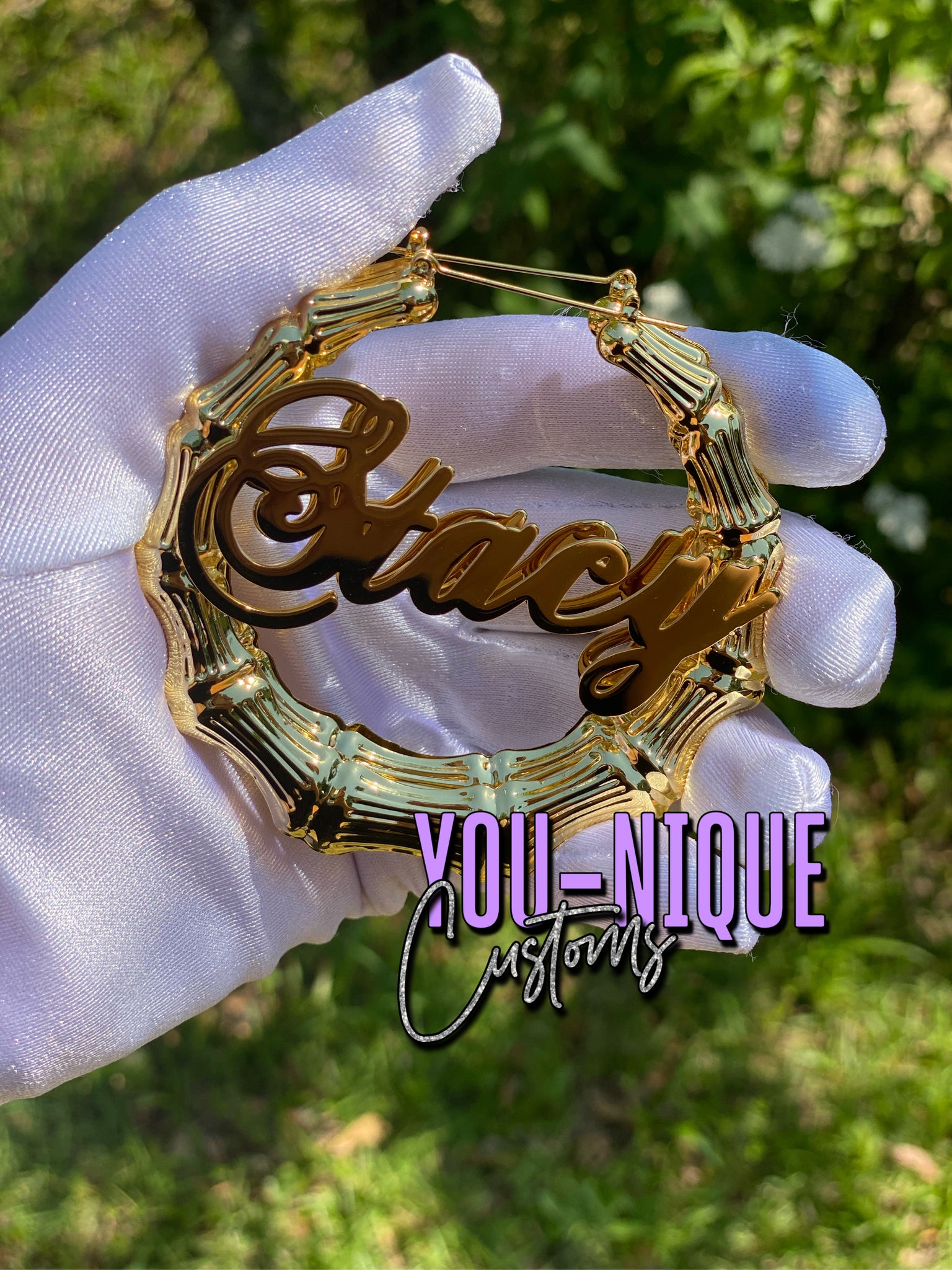 - Type the name you would like on your earrings in the custom details box