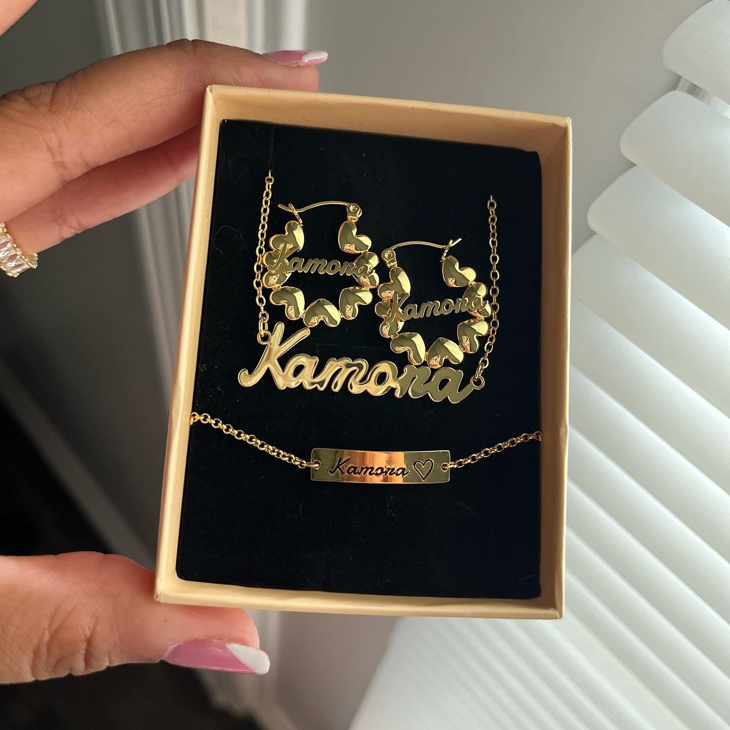 - Type the name you would like on your necklace, bracelet and earrings in the customs details box. If you would like a name at the top and a name underneath (necklace only) be very detail in the customs detail box.